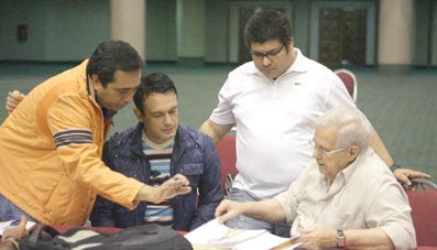 Ayer visitó las instalaciones del Hotel Maruma. Esta vez no se trajo a Osmel Sousa sino que vino con su asistente, Vicente Alvarado; Eric, el "Pollo" Simonato, director general del show, y Melvis Carrero, director de la Escuela de Ballet Doble Acción. Junto a ellos supervisó a los telistas zulianos que se presentarán la noche más linda del año.