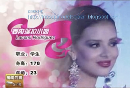 Así que a la voz de ¡¡paaarrrtiiidaaa!! arranco con el "parling" para contarles que ya se le están dando los toques finales a la edición número 49 del MISS INTERNATIONAL 2009, la cual se llevará a cabo este próximo sábado 28, acullá, en China, específicamente en el Venetian Resort, en Macai y donde cerca de 70 candidatas ¡se fajarán durísimo! por la corona que el año pasado ganó la española Alejandra Andreu, quien comenzó la cuenta regresiva para decirle ¡aaadiióossss! a su reinado, cediéndole, así, su lugar a la ganadora… entre las favoritas para el codiciado cetro figuran las representantes de Eslovaquia (Soña Skoncova), Colombia (Lina Mosquera), Rumania (Capsuc Iuliana), Francia (Mathilde Muller), Fillipinas (Melody Susbaach)... y ¡"soorrpraaiii, soorrpraiii"! nuestra paisana LASKMI RODRÍGUEZ, (a) "Mari Boquitas", cuyo nombre comenzó a sonar fuerte a última hora... y al decir de los reportes que me han remitido mis fuentes internacionales, ique, es una de las latinas que mayor impacto ha causado en los medios que están cubriendo las incidencias preliminares del mencionado certamen de belleza, el más importante del globo terráqueo, después del Miss Universo y el Miss Mundo... ¡Síii, señores!... La susodicha, que se fue sin hacer mucha bulla a esos lejanos predios, empezó a meterse por los palos en estos últimos días, alcanzando un inusitado favoritismo (Como siempre ocurre con las venezolanas) entre missólogos y missópatas extranjeros, por lo que no es de sorprender que se alce con el título… o al menos quede en el cuadro de honor... de ganar Laskmi Rodríguez (a) "Mari Boquitas, sería la sexta corona del Miss International que obtendría nuestro país, ya que hasta los momentos la han llevado en sus sienes Nina Sicilia (85), Consuelo Adler (97), Vivian Urdaneta (2000), Goizeder Azúa (2003) y Daniela Di Giacomo en el 2006..