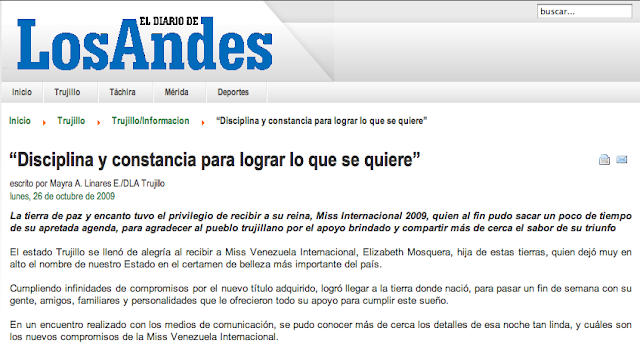 Para ninguna persona es un secreto que la competencia de este año de El Miss Venezuela 2009 estuvo muy reñida, y donde Elizabeth Mosquera, se coronó como Miss Venezuela International. Este 03 de enero del año 2010 ella parte rumbo a Colombia al reinado del café.